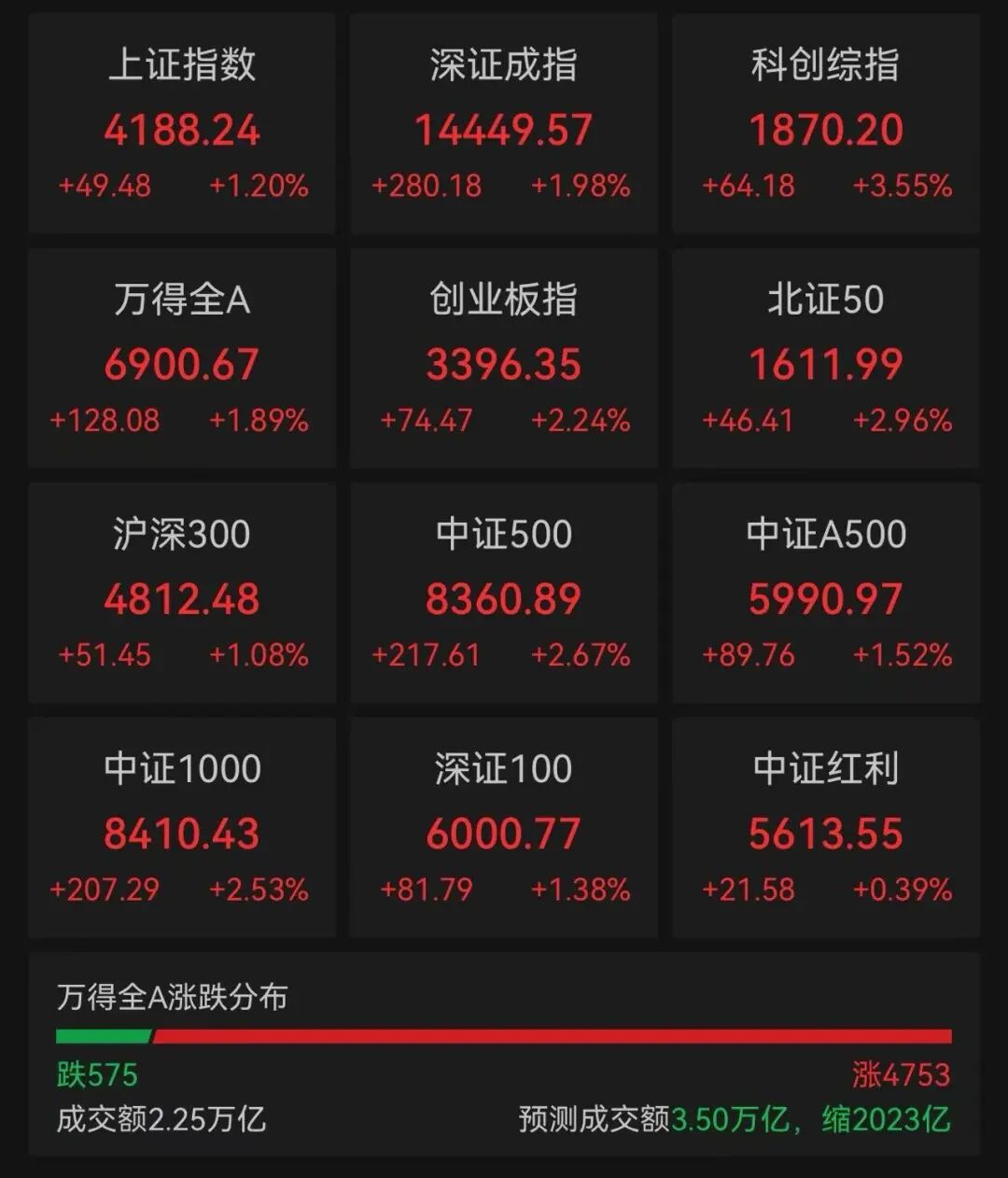 截至1月14日午间收盘,上证指数、深证成指、创业板指日内分别上涨1.20%、1.98%、2.24%,全市场4700余只个股上涨,全市场成交额2.25万亿元。此前,1月9日至13日,A股市场日成交额已连续三日突破3万亿元,并刷新历史最高日成交纪录。行业方面,互联网、软件、文化传媒等涨幅居前,AI应用板块继续走强。