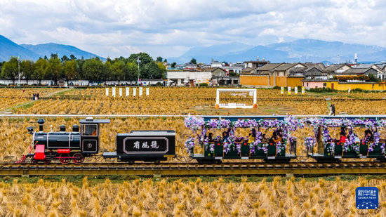 游客在喜洲古镇乘坐观光小火车(无人机照片)。