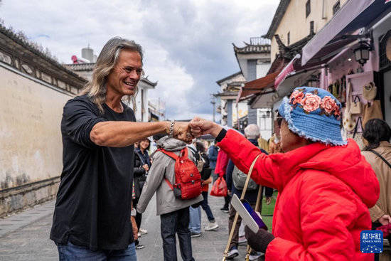 定居喜洲古镇的美国人林登(左)与一名新加坡游客碰拳致意。