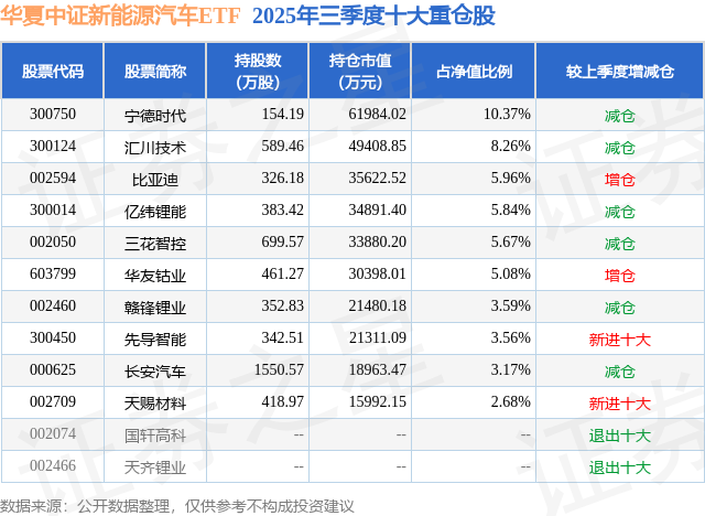 从基金规模来看,华夏中证新能源汽车ETF基金2025年三季度公布的基金规模为59.78亿元,较上一期规模42.33亿元变化了17.45亿元,环比变化了41.23%。该基金最新一期资产配置为:股票占净值比99.65%,无债券类资产,现金占净值比0.63%。从基金持仓来看,该基金当季前十大股票仓位达54.18%,第一大重仓股为宁德时代(300750),持仓占比为10.37%。