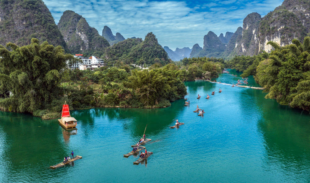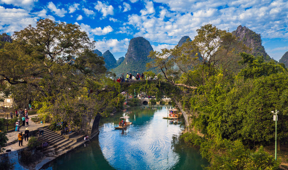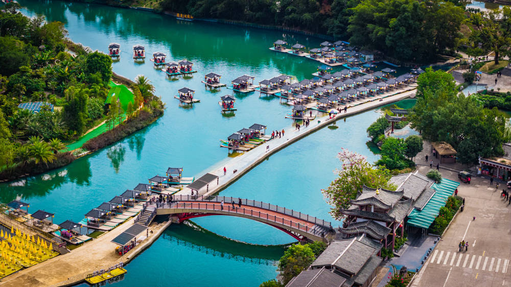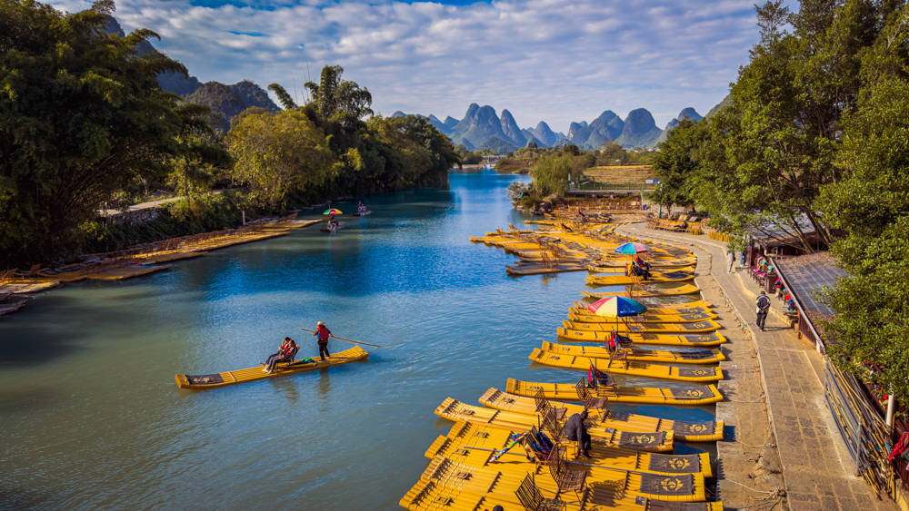 ↑2025年11月21日,游客在广西桂林市阳朔县遇龙河景区游玩。(无人机照片)CICPHOTO/国伏 摄