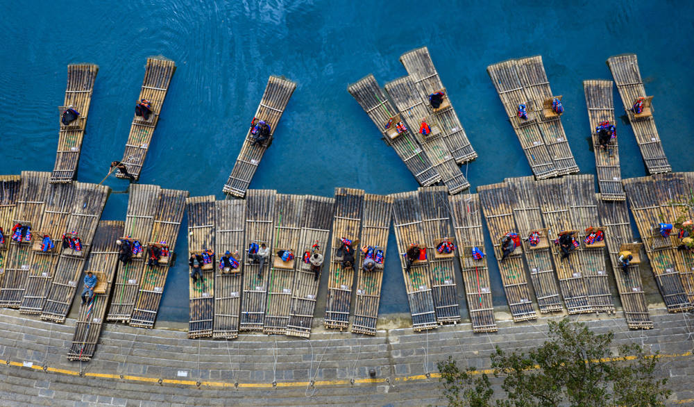 ↑2025年11月21日,在广西桂林市阳朔县遇龙河景区拍摄的停靠在岸边的竹筏。(无人机照片)CICPHOTO/国伏 摄编辑:张雪萌
