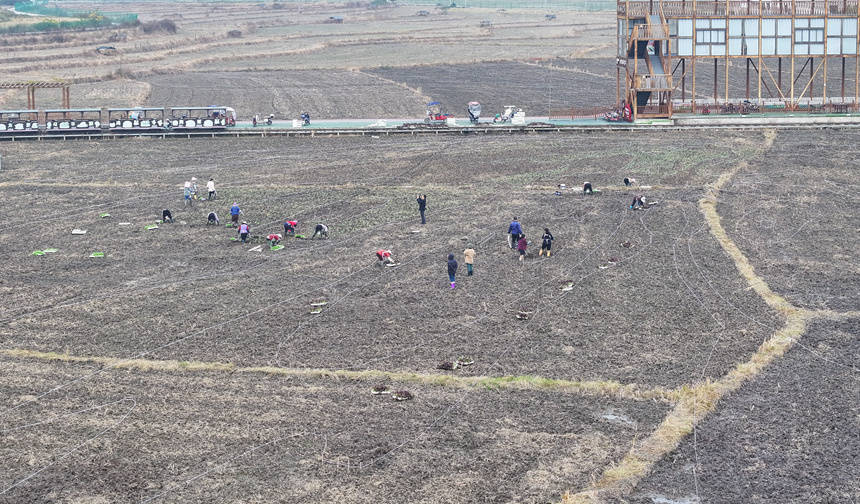 走进昊禹•稻花乡里的核心种植区,从空中俯瞰,由白色线条勾勒出的图案轮廓已清晰可见。20多名工人分散在田间,分工协作,运苗、分苗、挖坑、培土,动作娴熟,井然有序。一株株嫩绿的油菜苗被精准地栽种到预定区域,为冬日的大地铺展出生动的底色。这片繁忙景象的背后,不仅是景区为明年春季精心准备的一场视觉盛宴,还为周边村民提供了不少就业岗位。